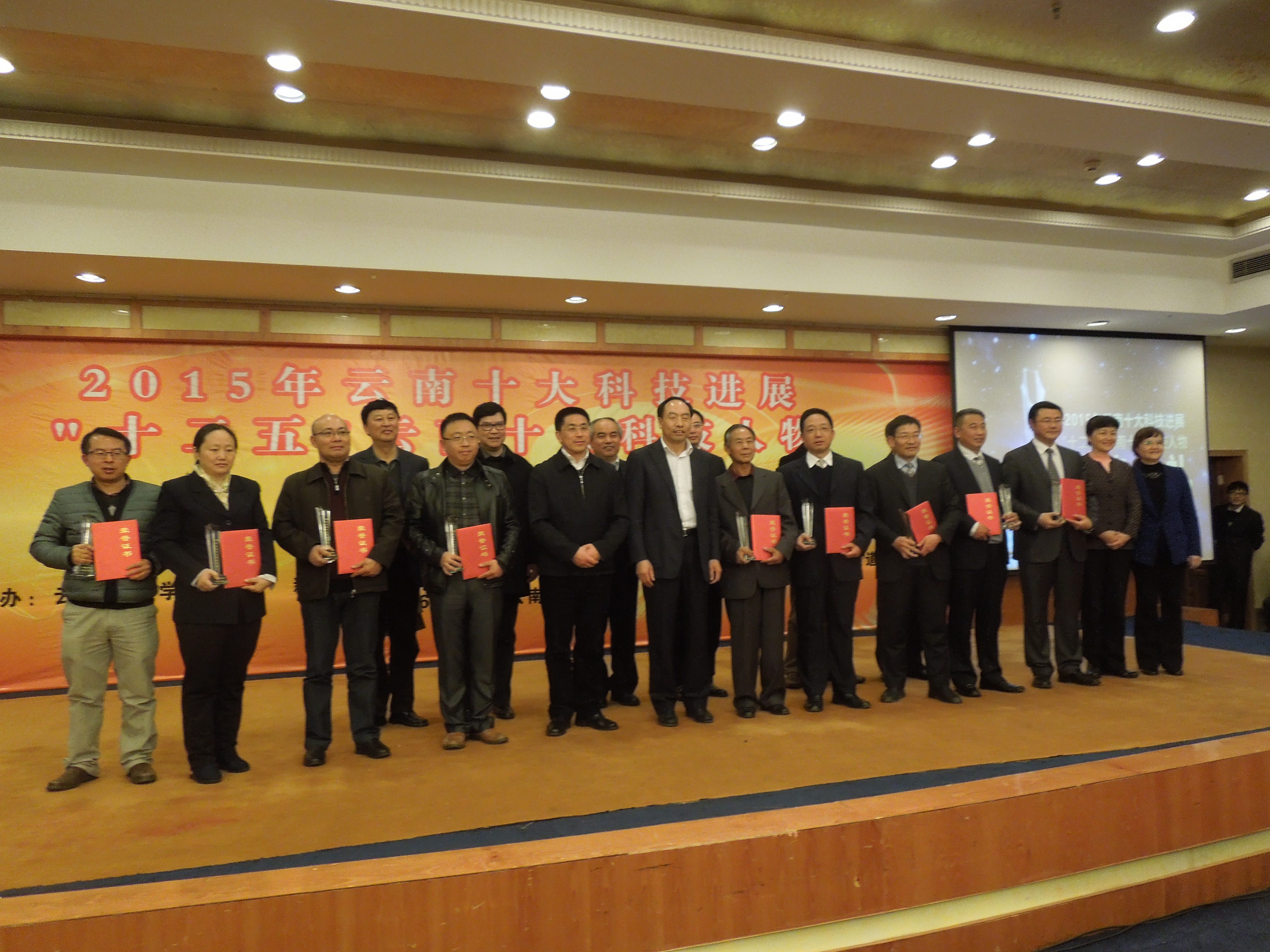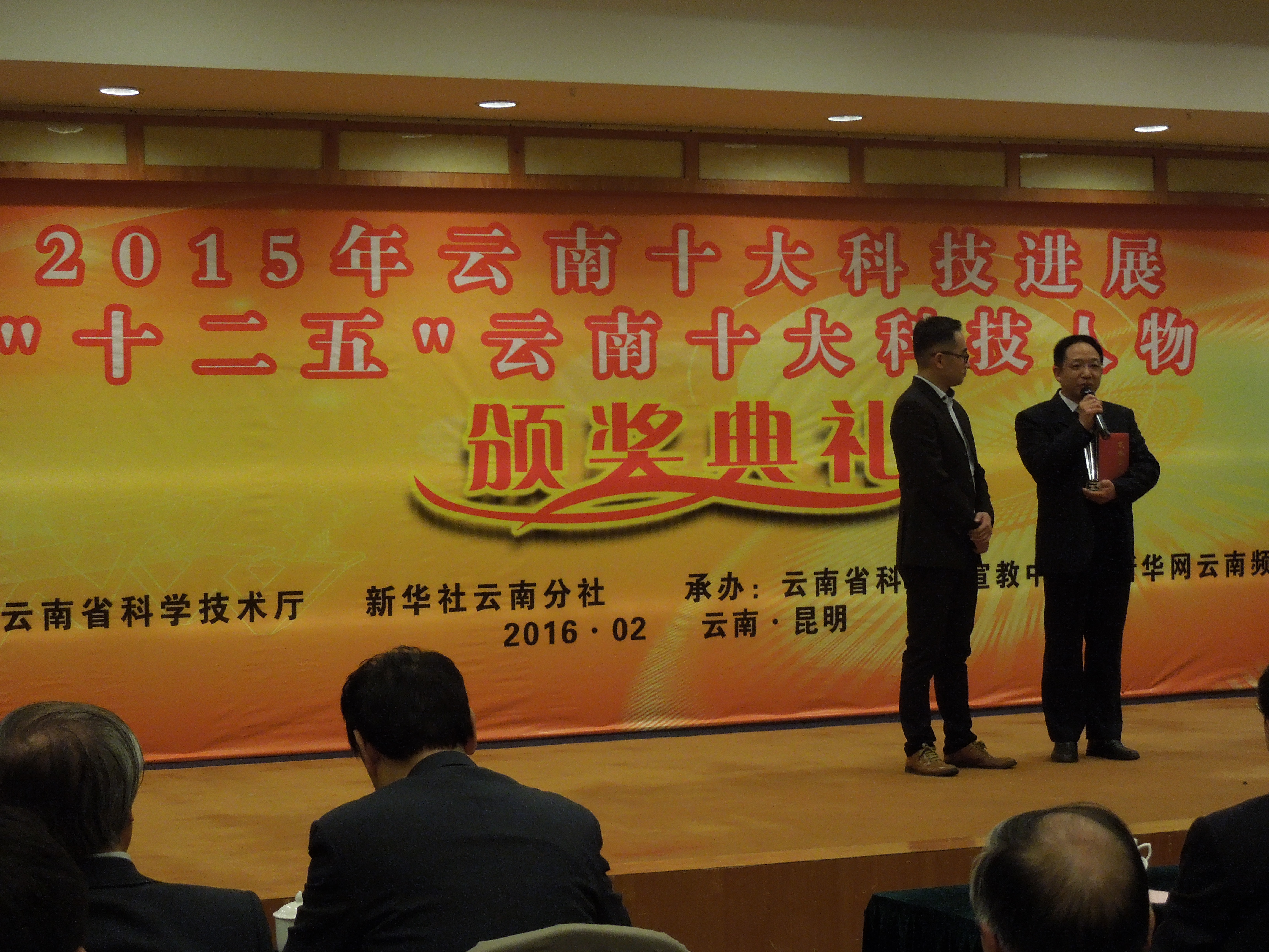 近日,由云南省科技厅、新华社云南分社共同主办,省科技厅宣教中心、新华网云南频道联合承办的“2015年云南十大科技进展和十二五云南十大科技人物”颁奖典礼在昆举行。我校云南水稻专家工作站承担的“建立玉米水稻丰产高效栽培技术体系保粮食高产”项目被评为十大科技进展。项目合作主持人杨从党研究员代表项目组领取了奖章和奖状,并发表了获奖感言。