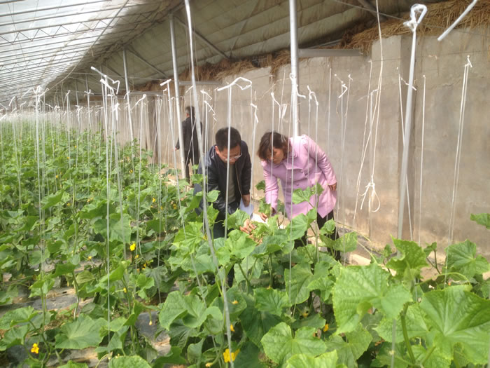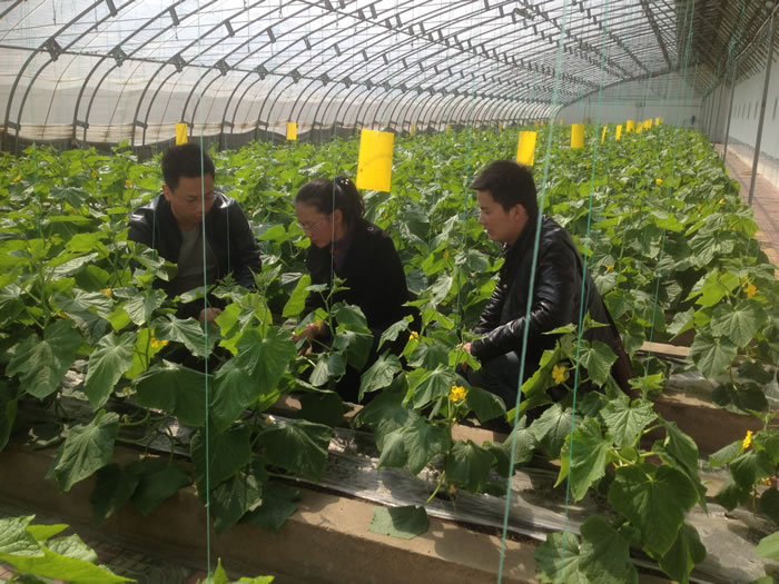 研究院科技工作者结合自身多年来的生产实践经验,实地考察了徐州久久农业公司、江苏守旭蔬菜土地股份专业合作社等项目核心示范点和新型经营主体,针对温室大棚内出现作物病虫害严重、田间管理不科学等问题等进行现场培训,向相关技术人员讲解了黄瓜等蔬菜肥水管理及病虫害防治等方面问题,并发放了试点工作推广的农药物资等。
