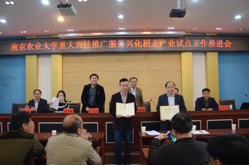 吴存发至欢迎词,他充分肯定了试点工作开展以来所取得的成绩。田永超汇报了基地建设与技术试验工作所取得的进展,沙安勤汇报了技术服务工作情况与成效。王明峰就推广“ 南农易农”APP以及创建兴化稻麦产业新型农业经营主体联盟等作了进一步说明。新型经营主体代表李德剑畅谈了重大农技推广服务试点工作开展以来的切身体会。最后,李玉清向周有炎和陈春生两位地方专家颁发了外聘专家聘书,并做总结发言。