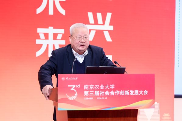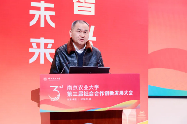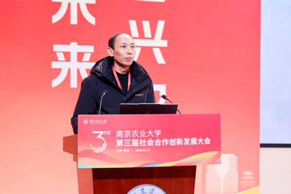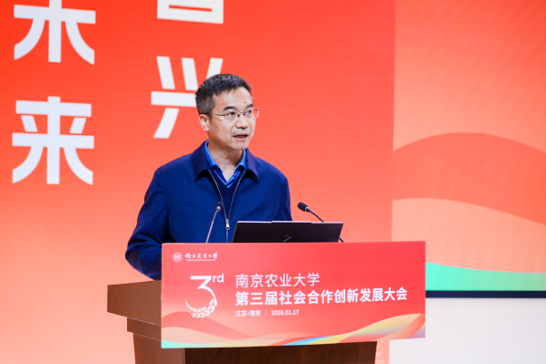 1月17日,南京农业大学第三届社会合作创新发展大会召开。大会以“聚智兴农 融创未来”为主题,共探农业科技创新与产业融合发展新路径。会上,江苏省概念验证中心(南京农业大学现代农业领域)揭牌,南京农业大学2025年度省级现代农业关键技术集成推广项目正式启动,“水稻穴穗粒三均衡群体构建技术”“小麦种肥精量条带压播高产高效栽培技术”“植物广谱免疫激活剂‘楠秾佑康’®”等南京农业大学2025年度十大农业科技应用成果同期发布。