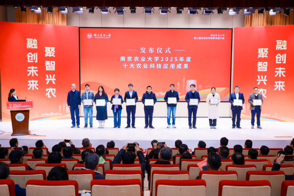 破解水稻“高产不优质”难题、小麦压播新方案、植物抗病“免疫神器”……大会发布了直击生产痛点的南京农业大学2025年度“十大农业科技应用成果”,分别为:水稻穴穂粒三均衡群体构建技术、小麦种肥精量条带压播高产高效栽培技术、植物广谱免疫激活剂“楠秾佑康®”、新型特殊环境生防芽胞杆菌产品、黄瓜新品种‘南农小爱’及轻简高效生产技术、秸秆火焰高温瞬时灭活还田技术、奶牛乳腺炎综合防控技术、靶向糖脂代谢调节的功能性益生菌产品、无人驾驶水田电动机械除草机器人、天然小分子植物诱抗剂氨甲己酸产品。